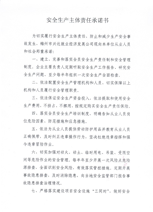 安全生產主體責任承諾書
